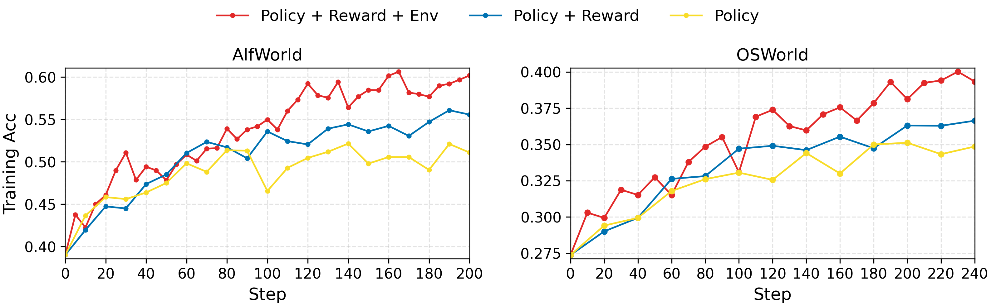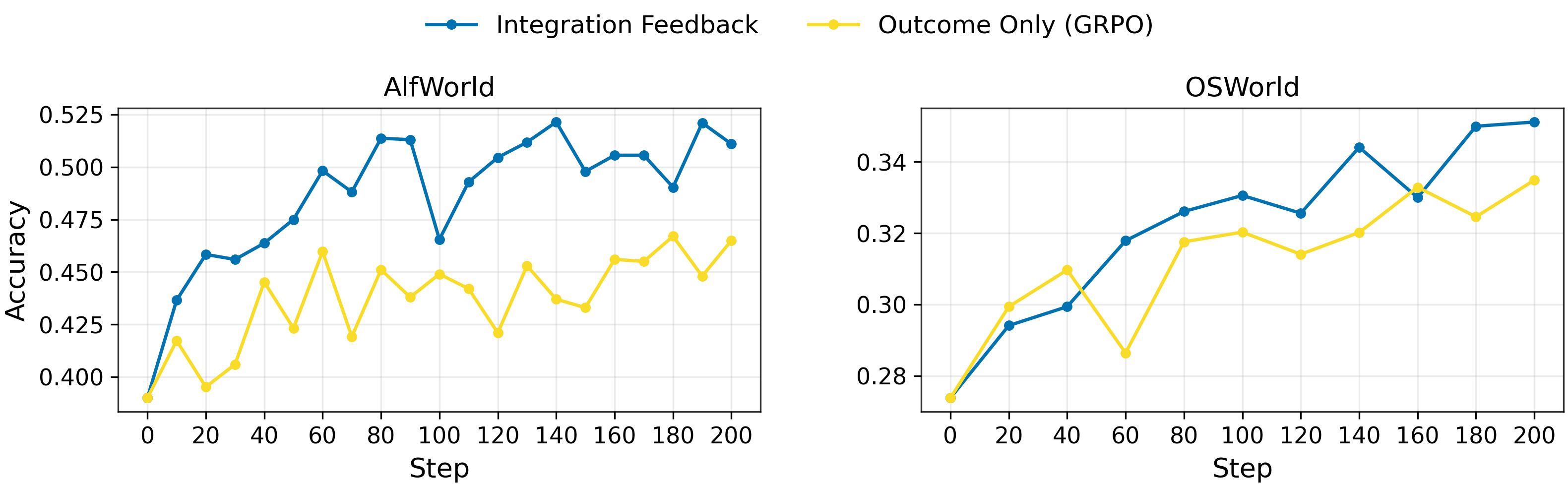 We compare two training signals: step-wise signals from the optimized reward model and outcome signals. We find that the optimized reward model provides substantially stronger supervision. In real-world applications such as GUI agents, outcome rewards often require humans to create verifier files, which limits scalability. Motivated by these results, self-exploring agents in large-scale environments such as computers become more promising.