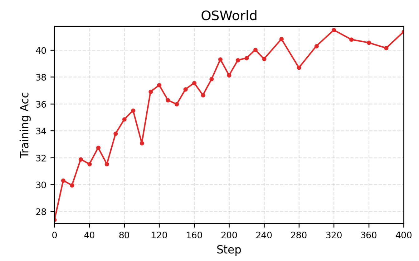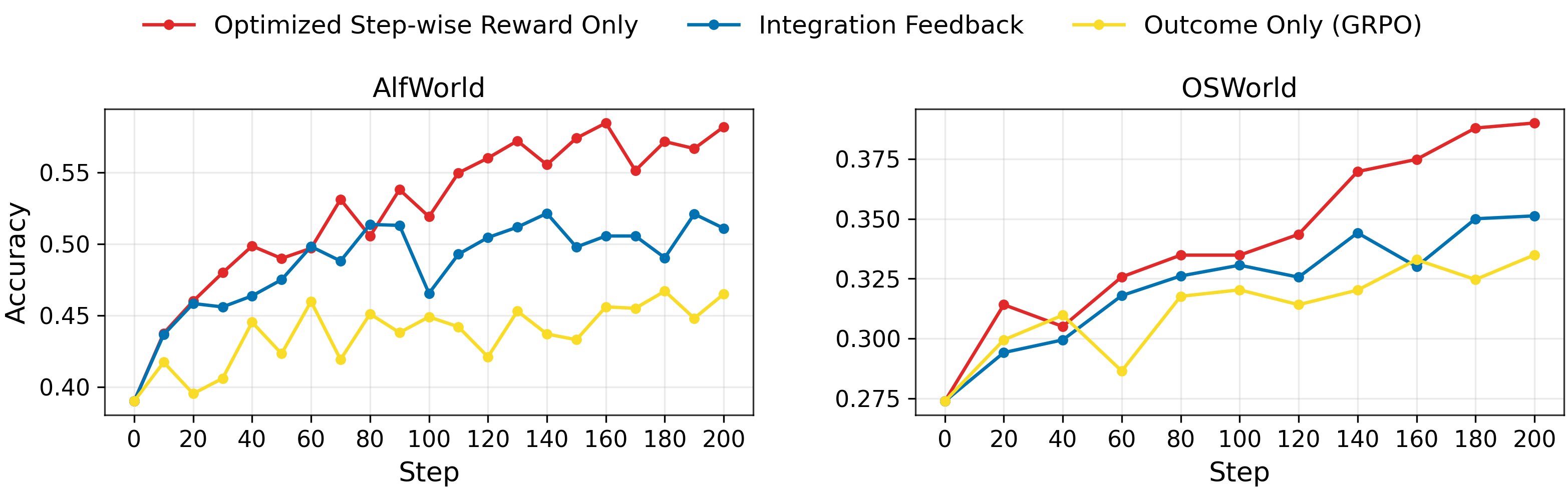\[R_{\tau_i} = O_{\tau} + \sum_{j = 1}^m S_{\tau_i, j} / m,\]where \( \lambda \) (1 by default) balances the trade-off between outcome supervision and step-wise supervision. Note that we compute advantages by standardizing rewards across trajectories at the same step index \(i\), i.e., over the set \( \{ R_{\tau_i} \mid \tau \sim \pi (\cdot \mid q) \} \). From the following figures, we find this integrated feedback is vital for long trajectory tasks.