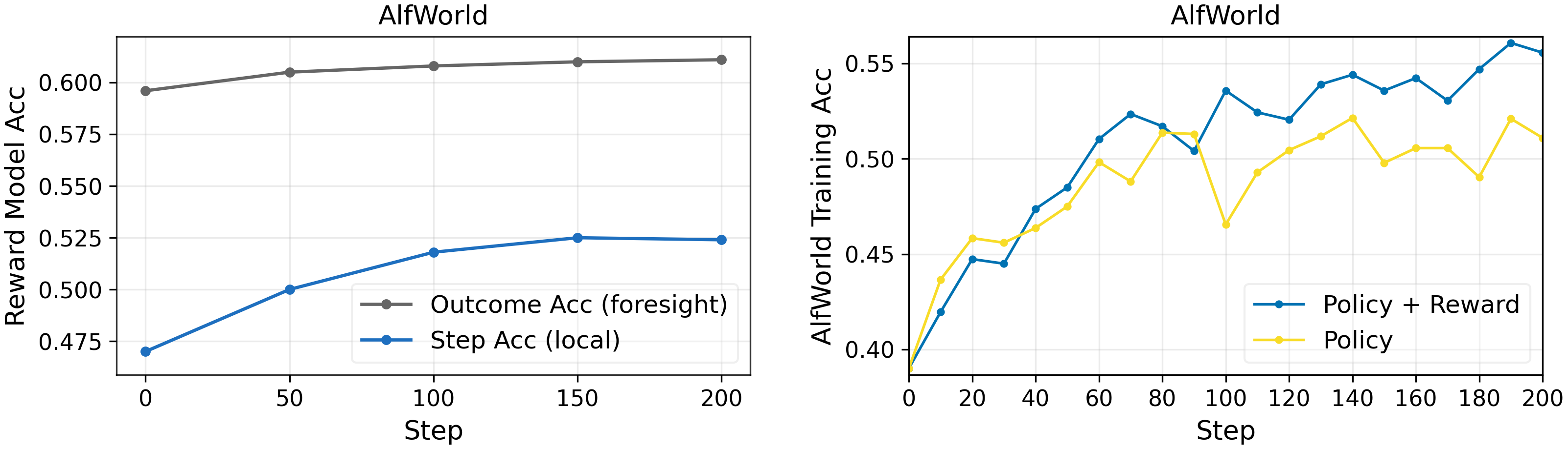 \[R_{S_{\tau_i, j}} = R_{\tau_i} \cdot S_{\tau_i, j},\]where the supervision is consisted of both outcome and self-consistency signals. We evaluate two aspects of reward modeling. First, we assess the ability to detect errors at the current step (we obtain step-wise ground-truth labels via majority voting from a much stronger reasoning model). Second, we assess its ability to predict the influence on final outcome; we use the episode outcome as the label for this evaluation. From the following figure, we kown the reward quality is improving and further improves policy training.