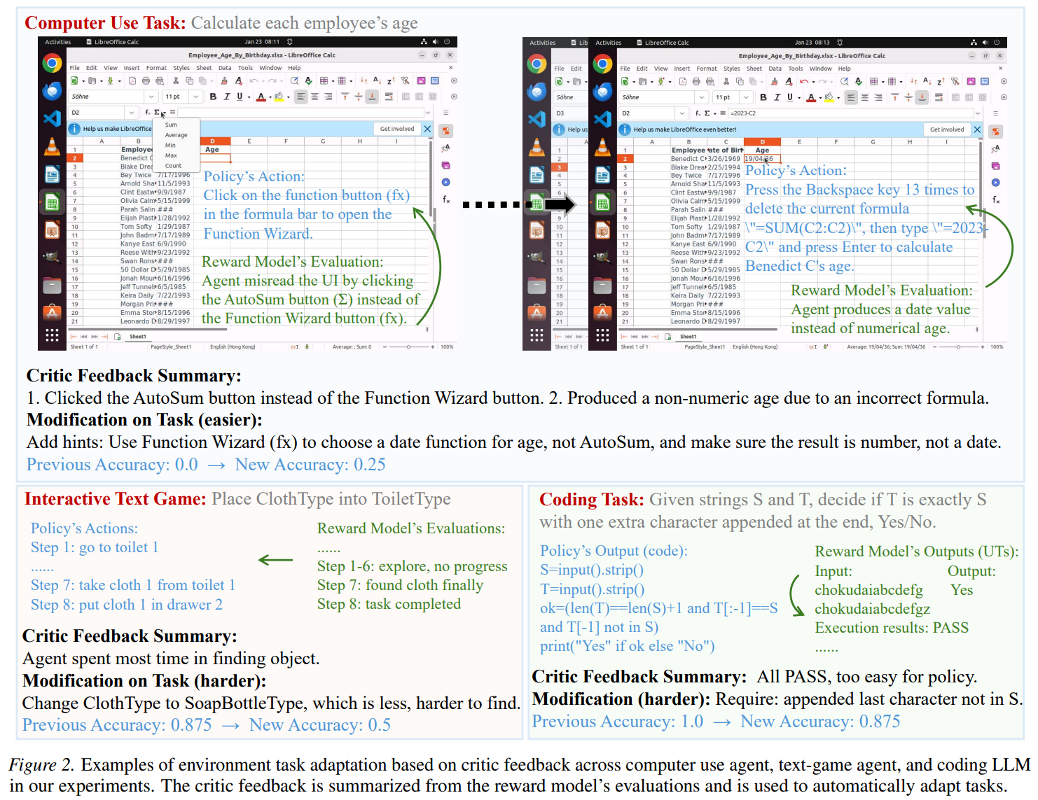 Building on the above insights, we now propose a targeted and automated approach to task adaptation. If the policy’s accuracy on \(q\) falls outside \((\alpha_{\text{low}}, \alpha_{\text{high}})\), we ask a language model to modify \(q\) into \(q’\) using a summarized critic derived from \(\{r_{\tau_i,j} \mid \tau \sim \pi(\cdot \mid q), \forall i,j\}\), i.e., the reward model’s previous outputs. The quality of the new task \(q’\) is ensured by our acceptance mechanism. If the goal is to make \(q\) harder, we replace it with \(q’\) only if \(\alpha_{\text{low}} < acc(q’) < acc(q)\). If the goal is to make \(q\) easier, we replace it with \(q’\) only if \(acc(q) < acc(q’) < \alpha_{\text{high}}\). By default, we set \(\alpha_{\text{low}} = 0.2\) and \(\alpha_{\text{high}} = 0.8\). Note that the correctness of \(q’\) is also guaranteed, since it must yield at least one successful rollout (i.e., \(acc(q’) > 0\)).