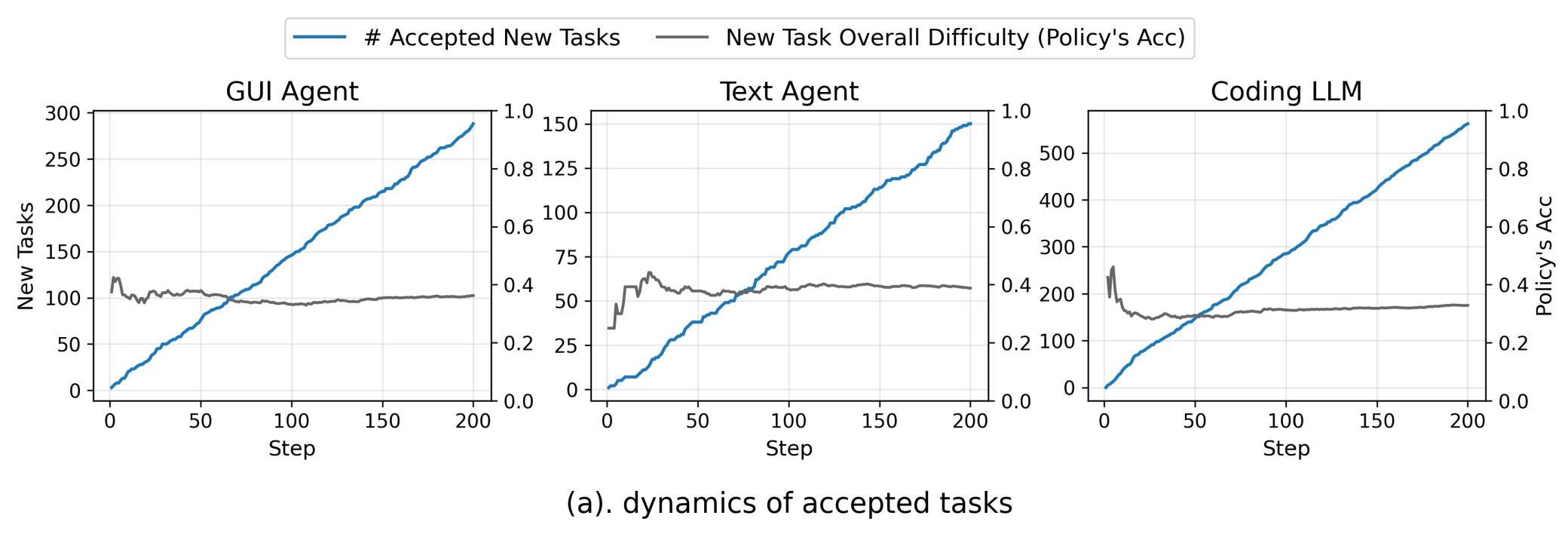 We find that the number of accepted new environment tasks grows approximately linearly, demonstrating the potential for environment scaling. In our text-agent (AlfWorld) and coding settings, new tasks are generated fully automatically by language models. In the GUI-agent setting (OSWorld), we pre-create additional verifier files. Although task modification and hint generation are still automated in the GUI setting, the need to pre-create verifiers can limit automation and scalability, making this an important direction for future work.