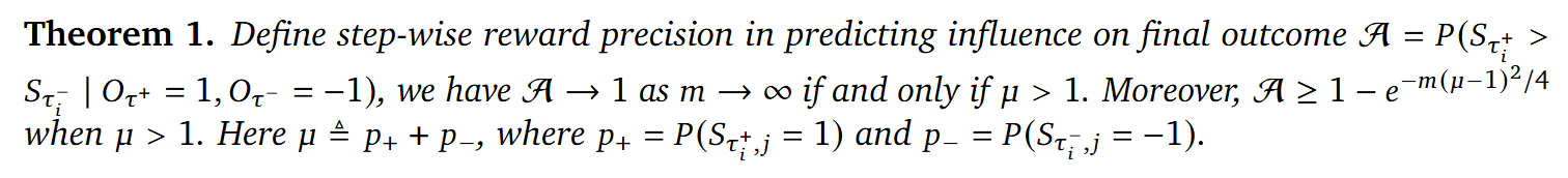 We know balancing task difficulty can improve policy training. We present two simple theoretical results showing that, under our reward system, this approach also improves reward-model training. Theorem 1 transforms the objective of predicting each step’s influence on the final outcome, into two terms (\( p_{+}\) and \( p_{-}\)) that can be estimated from our rollout data.
