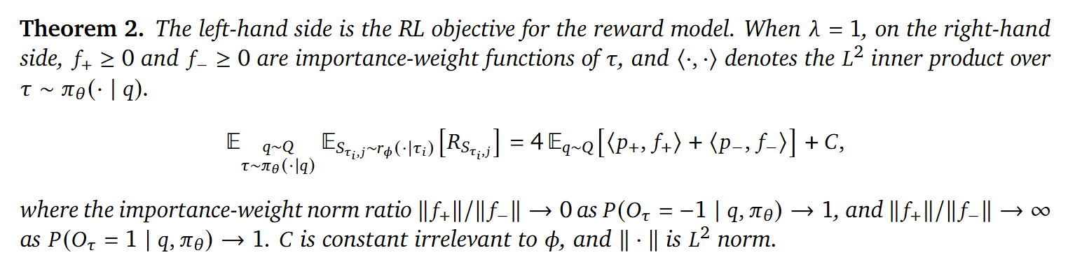 This theorem highlights the necessity of balancing the importance-sampling ratio between \( p_{+}\) and \( p_{-}\) to prevent bias in reward-model optimization. We then use the following Theorem 2 to show that our actual optimization target reduces to estimator of \(\mu \) and that task-difficulty balancing guarantees a well-behaved importance-sampling ratio.